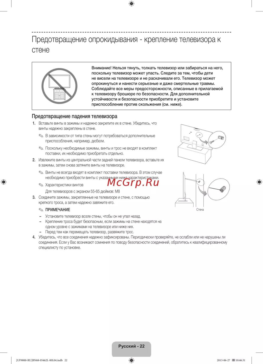 - Предотвращение опрокидывания крепление телевизора к стене p.22