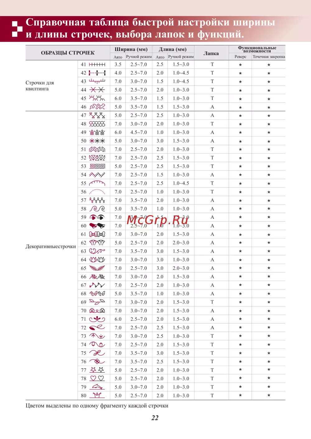 Справочная таблица быстрой настройки ширины и длины строчек выбора лапок и функций ОБРАЗЦЫ СТРОЧЕК Строчки для квилтинга Декоративны естрочки Ширина мм Длина мм АвтоРучной режимАвтоРучной режим Ланка Функциональные возможности Реверс Точечная закрепка 41 1111111 3 5 2 5 7 0 2 5 1 5 3 0 т 42 Ц 4 0 2 5 7 0 2 0 1 0 4 5 т 43 111 7 0 3 0 7 0 1 5 1 0 4 5 т 44 5 0 2 5 7 0 2 0 1 0 3 0 т 45 6 0 3 5 7 0 1 5 1 0 3 0 т 46 Ж 5 0 3 5 7 0 1 5 1 5 3 0 А 47 5 0 2 5 7 0 2 5 1 0 3 0 А 48 УгУтУ 7 0 3 0 7 0 2 0 1 0 3 0 Т 49 Ш 6 0 4 5 7 0 1 0 1 0 3 0 А 50 5 0 3 0 7 0 3 0 1 5 3 0 А 51 7 0 2 5 7 0 2 0 1 0 3 0 Т 52 7 0 2 5 7 0 2 5 1 5 3 0 Т 53 131131131 5 0 2 5 7 0 2 5 1 5 3 0 Т 54 7 0 2 5 7 0 1 5 1 0 3 0 А 55 Г1 А 7 0 2 5 7 0 2 5 1 0 4 5 Т 56 7 0 2 5 7 0 1 0 1 0 3 0 Т 57 УЛ 7 0 3 5 7 0 2 0 1 0 3 0 А 58 59 5 0 3 5 7 0 1 0 1 0 3 0 А 7 0 3 0 7 0 1 5 1 5 3 0 А 60 7 0 2 5 7 0 1 0 1 0 3 0 А 61 7 0 3 0 7 0 2 0 1 5 3 0 А 62 Ж 7 5 0 2 5 7 0 2 0 2 0 3 0 А 63 7 0 3 5 7 0 3 0 1 5 3 0 А 64 7 0 3 0 7 0 3 0 1 0 3 0 А 65 7 0 2 5 7 0 3 0 2 0 3 0 А 66 7 0 3 0 7 0 2 0 1 5 3 0 А 67 ЛА 7 0 2 5 7 0 2 0 1 0 3 0 А 68 5 0 3 5 7 0 1 0 1 0 3 0 А 69 2 7 0 3 0 7 0 2 0 1 5 3 0 Т 70 7 0 3 0 7 0 2 0 1 5 3 0 А 71 6 0 2 5 7 0 2 0 1 5 3 0 А 72 7 0 2 5 7 0 2 5 1 5 3 0 А 73 7 0 3 0 7 0 2 5 1 0 3 0 Т 74 ЧАД 7 0 2 5 7 0 2 0 1 5 3 0 Т 75 АС 7 0 3 5 7 0 3 0 1 5 3 0 Т 76 8 7 0 3 5 7 0 2 5 1 5 3 0 Т 77 5 0 2 5 7 0 2 0 1 0 3 0 Т 78 2 2 5 0 2 5 7 0 2 0 1 0 3 0 Т 79 А 5 0 3 0 7 0 2 0 1 0 3 0 т 80 УГ 5 0 2 5 7 0 2 0 1 0 3 0 т Цветом выделены по одному фрагменту каждой строчки 22