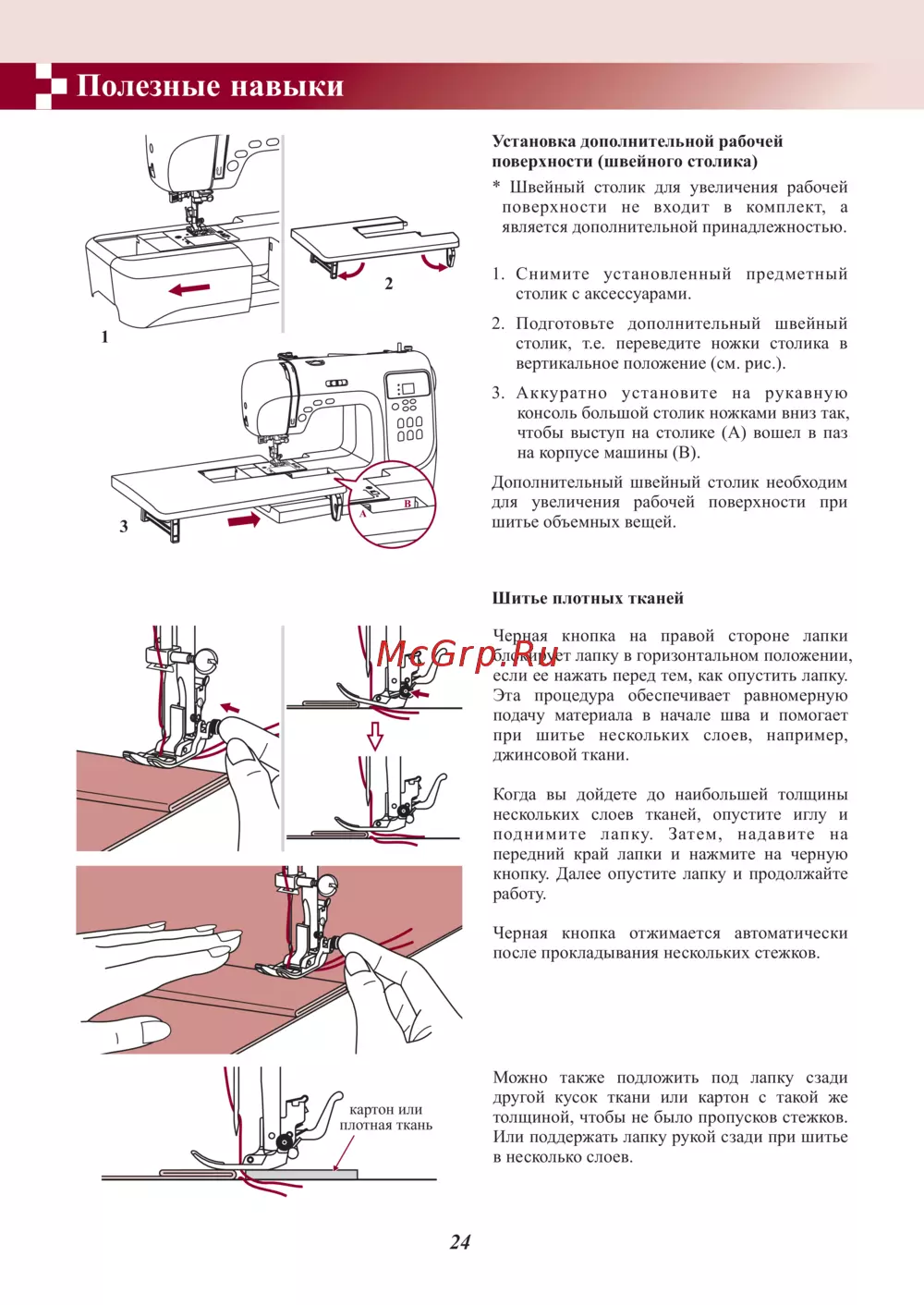 Полезные навыки Установка дополнительной рабочей поверхности швейного столика Швейный столик для увеличения рабочей поверхности нс входит в комплект а является дополнительной принадлежностью 1 Снимите установленный столик с аксессуарами 2 Подготовьте дополнительный швейный столик т е переведите ножки столика в вертикальное положение см рис 3 Аккуратно установите на рукавную консоль большой столик ножками вниз так чтобы выступ на столике А вошел в паз на корпусе машины В Дополнительный швейный для увеличения рабочей шитье объемных вещей предметный столик необходим поверхности при Шитье плотных тканей Черная кнопка на правой стороне лапки блокирует лапку в горизонтальном положении если ее нажать перед тем как опустить лапку Эта процедура обеспечивает равномерную подачу материала в начале шва и помогает при шитье нескольких слоев например джинсовой ткани Когда вы дойдете до наибольшей толщины нескольких слоев тканей опустите иглу и поднимите лапку Затем надавите на передний край лапки и нажмите на черную кнопку Далее опустите лапку и продолжайте работу Черная кнопка отжимается автоматически после прокладывания нескольких стежков Можно также подложить под лапку сзади другой кусок ткани или картон с такой же толщиной чтобы нс было пропусков стежков Или поддержать лапку рукой сзади при шитье в несколько слоев 24