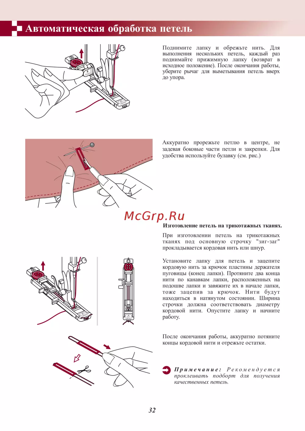 Автоматическая обработка петель Поднимите лапку и обрежьте нить Для выполнения нескольких петель каждый раз поднимайте прижимную лапку возврат в исходное положение После окончания работы уберите рычаг для выметывания петель вверх до упора Аккуратно прорежьте петлю в центре нс задевая боковые части петли и закрепки Для удобства используйте булавку см рис Изготовление петель на трикотажных тканях При изготовлении петель на трикотажных тканях под основную строчку зиг заг прокладывается кордовая нить или шнур Установите лапку для петель и зацепите кордовую нить за крючок пластины держателя пуговицы конец лапки Протяните два конца нити по канавкам лапки расположенных на подошве лапки и завяжите их в начале лапки тоже зацепив за крючок Нити будут находиться в натянутом состоянии Ширина строчки должна соответствовать диаметру кордовой нити Опустите лапку и начните работу После окончания работы аккуратно концы кордовой нити и отрежьте остатки Примечание проклеивать подборт качественных петель 32 потяните Рекомендуется для получения