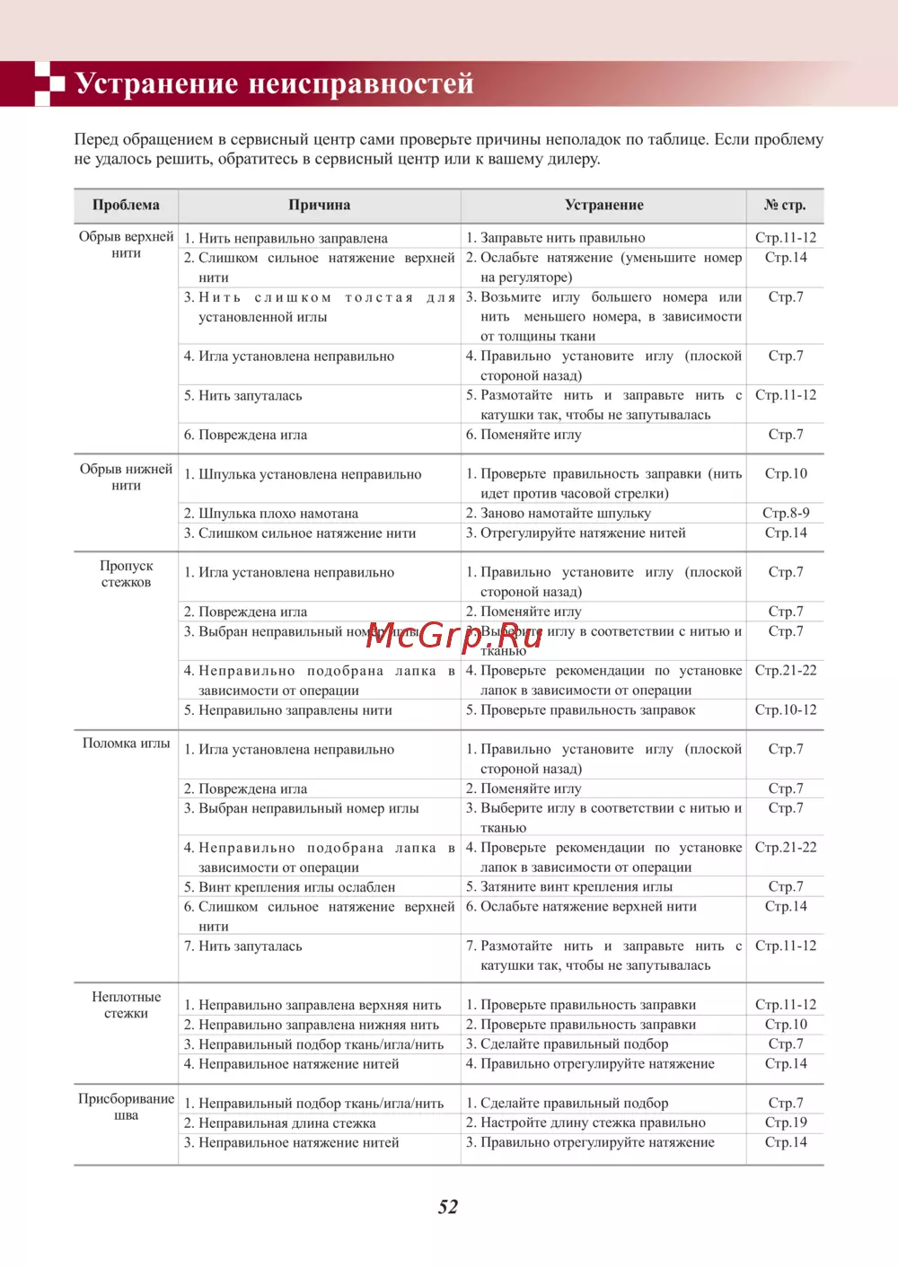 Устранение неисправностей Перед обращением в сервисный центр сами проверьте причины неполадок по таблице Если проблему нс удалось решить обратитесь в сервисный центр или к вашему дилеру Проблема Причина Устранение Обрыв верхней 1 11ить неправильно заправлена нити 2 Слишком сильное натяжение верхней нити 3 Пить слишком толстая для установленной иглы 4 Игла установлена неправильно 5 11ить запуталась 6 Повреждена игла Обрыв нижней 1 Шпулька установлена неправильно нити Пропуск стежков Стр 10 Стр 8 9 Стр 14 1 Правильно установите иглу плоской Стр 7 стороной назад 2 Поменяйте иглу Стр 7 3 Выберите иглу в соответствии с нитью и Стр 7 тканью 4 Проверьте рекомендации по установке Стр 21 22 лапок в зависимости от операции 5 Проверьте правильность заправок Стр 10 12 1 Игла установлена неправильно 2 Повреждена игла 3 Выбран неправильный номер иглы 4 Неправильно подобрана лапка в зависимости от операции 5 Неправильно заправлены нити Поломка иглы 1 Игла установлена неправильно 2 Повреждена игла 3 Выбран неправильный номер иглы 4 Неправильно подобрана лапка в зависимости от операции 5 Винт крепления иглы ослаблен 6 Слишком сильное натяжение верхней нити 7 11ить запуталась 11еплотные стежки 1 Заправьте нить правильно Стр 11 12 2 Ослабьте натяжение уменьшите номер Стр 14 на регуляторе 3 Возьмите иглу большего номера или Стр 7 нить меньшего номера в зависимости от толщины ткани 4 Правильно установите иглу плоской Стр 7 стороной назад 5 Размотайте нить и заправьте нить с Стр 11 12 катушки так чтобы не запутывалась 6 Поменяйте иглу Стр 7 1 Проверьте правильность заправки нить идет против часовой стрелки 2 Заново намотайте шпульку 3 Отрегулируйте натяжение нитей 2 Шпулька плохо намотана 3 Слишком сильное натяжение нити стр 1 Правильно установите иглу плоской Стр 7 стороной назад 2 Поменяйте иглу Стр 7 3 Выберите иглу в соответствии с нитью и Стр 7 тканью 4 Проверьте рекомендации по установке Стр 21 22 лапок в зависимости от операции 5 Затяните винт крепления иглы Стр 7 6 Ослабьте натяжение верхней нити Стр 14 7 Размотайте нить и заправьте нить с Стр 11 12 катушки так чтобы не запутывалась 1 11еправильно заправлена верхняя нить 2 Неправильно заправлена нижняя нить 3 Неправильный подбор ткань игла ннть 4 11еправильное натяжение нитей 1 Проверьте правильность заправки 2 Проверьте правильность заправки 3 Сделайте правильный подбор 4 Правильно отрегулируйте натяжение Стр 11 12 Стр 10 Стр 7 Стр 14 Присборивание 1 Неправильный подбор ткань игла ннть шва 2 11еправильная длина стежка 3 Неправильное натяжение нитей 1 Сделайте правильный подбор 2 11астройте длину стежка правильно 3 Правильно отрегулируйте натяжение Стр 7 Стр 19 Стр 14 52