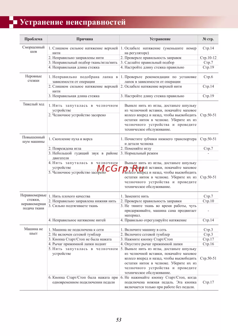 Устранение неисправностей Проблема Причина Устранение стр Сморщенный шов 1 Слишком сильное натяжение верхней нити 2 Неправильно заправлены нити 3 11еправильный подбор ткань игла нить 4 11еправильная длина стежка 1 Ослабьте натяжение уменьшите номер Стр 14 на регуляторе 2 Проверьте правильность заправок Стр 10 12 3 Сделайте правильный подбор Стр 7 4 11астройте длину стежка правильно Стр 19 I кровные стежки 1 Неправильно подобрана лапка в зависимости от операции 2 Слишком сильное натяжение верхней нити 3 11еправильная длина стежка 1 Проверьте рекомендации по установке лапок в зависимости от операции 2 Ослабьте натяжение верхней нити Стр 14 3 11астройте длину стежка правильно Стр 19 Тяжелый ход Повышенный шум машины 1 Пить запуталась в челночном устройстве 2 Челночное устройство засорено 1 Скопление пуха и ворса 2 Повреждена игла 3 Небольшой гудящий звук в районе двигателя 4 Нить запуталась в челночном устройстве 5 Челночное устройство засорено 11ерав номерные 1 11ить плохого качества стежки 2 Неправильно заправлена нижняя нить неравномерная 3 Сильно подтягиваете ткань подача ткани 4 11еправильное натяжение нитей Машина не шьет 1 Машина не подключена к сети 2 Не включен сетевой тумблер 3 Кнопка Старт Стоп не была нажата 4 Рычаг прижимной лапки поднят 5 Нить запуталась в челночном устройстве 6 Кнопка Старт Стоп была нажата при одновременном подключении педали Стр 6 Выньте нить из иглы достаньте шпульку из челночной вставки покачайте маховое колесо вперед и назад чтобы высвободить Стр 50 51 остатки ниток в челноке Уберите их из челночного устройства и проведите техническое обслуживание 1 Почистите зубчики нижнего транспортера Стр 50 51 и детали челнока 2 Поменяйте иглу Стр 7 3 Нормальный режим Выньте нить из иглы достаньте шпульку из челночной вставки покачайте маховое колесо вперед и назад чтобы высвободить остатки ниток в челноке Уберите их из Стр 50 51 челночного устройства и проведите техническое обслуживание 1 Замените нить 2 Проверьте правильность заправки 3 Пе тяните ткань во время работы чуть придерживайте машина сама продвигает материал 4 Правильно отрегулируйте натяжение Стр 7 Стр 10 Стр 14 1 Включите машину в сеть Стр З 2 Включите сетевой тумблер Стр З 3 11ажмите кнопку Старт Стоп Стр 17 4 Опустите рычаг прижимной лапки Стр 16 5 Выньте нить из иглы достаньте шпульку из челночной вставки покачайте маховое колесо вперед и назад чтобы высвободить Стр 50 51 остатки ниток в челноке Уберите их из челночного устройства и проведите техническое обслуживание 6 Пе нажимайте кнопку Старт Стоп когда подключена ножная педаль Эта кнопка Стр 17 включается только при работе без педали