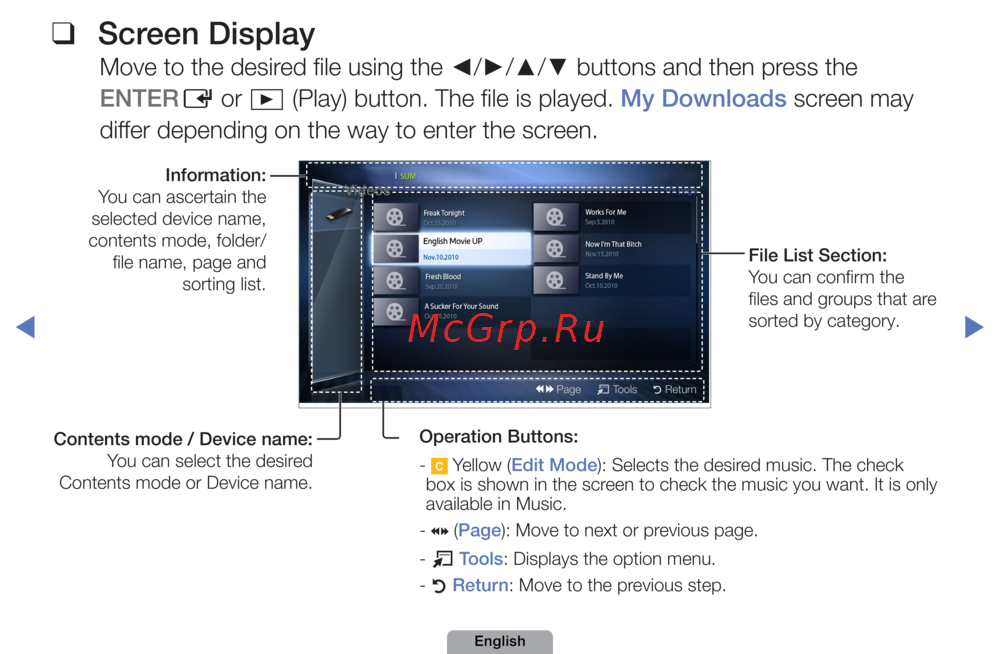 - Move to the desired file using the buttons and then press the enter e or play button the file is played my downloads screen may differ depending on the way to enter the screen p.128