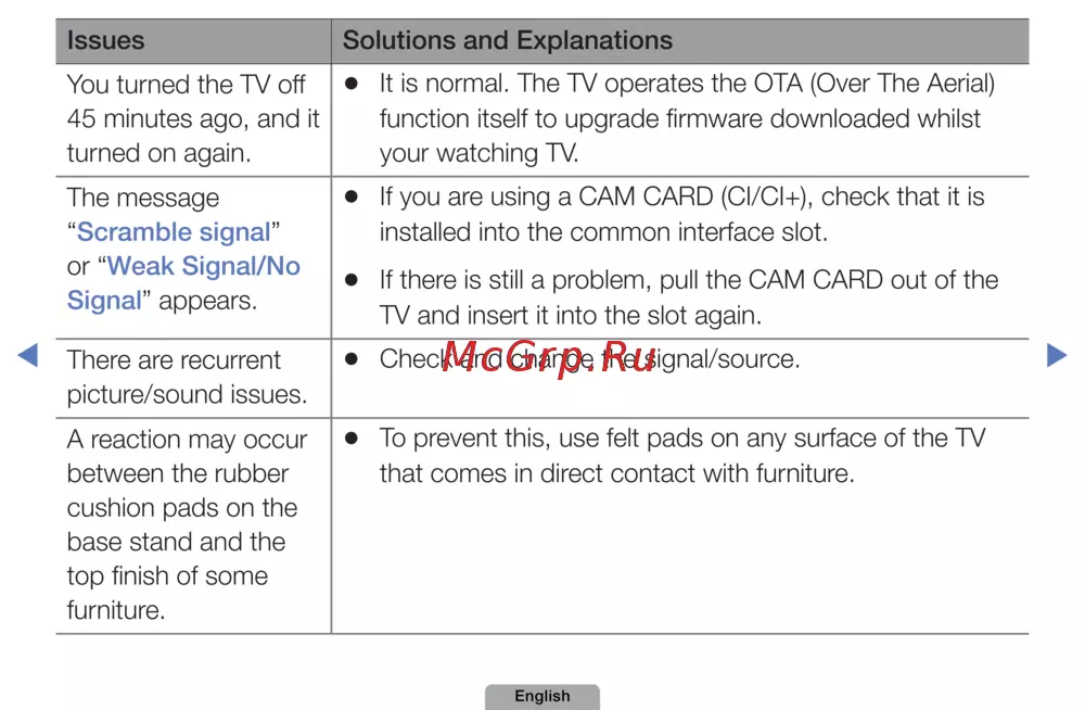 To prevent this, use felt pads on any surface of the TV