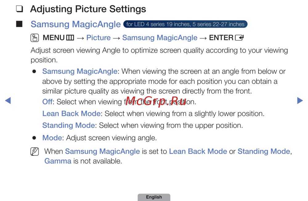 When Samsung MagicAngle is set to Lean Back Mode or Standing Mode,