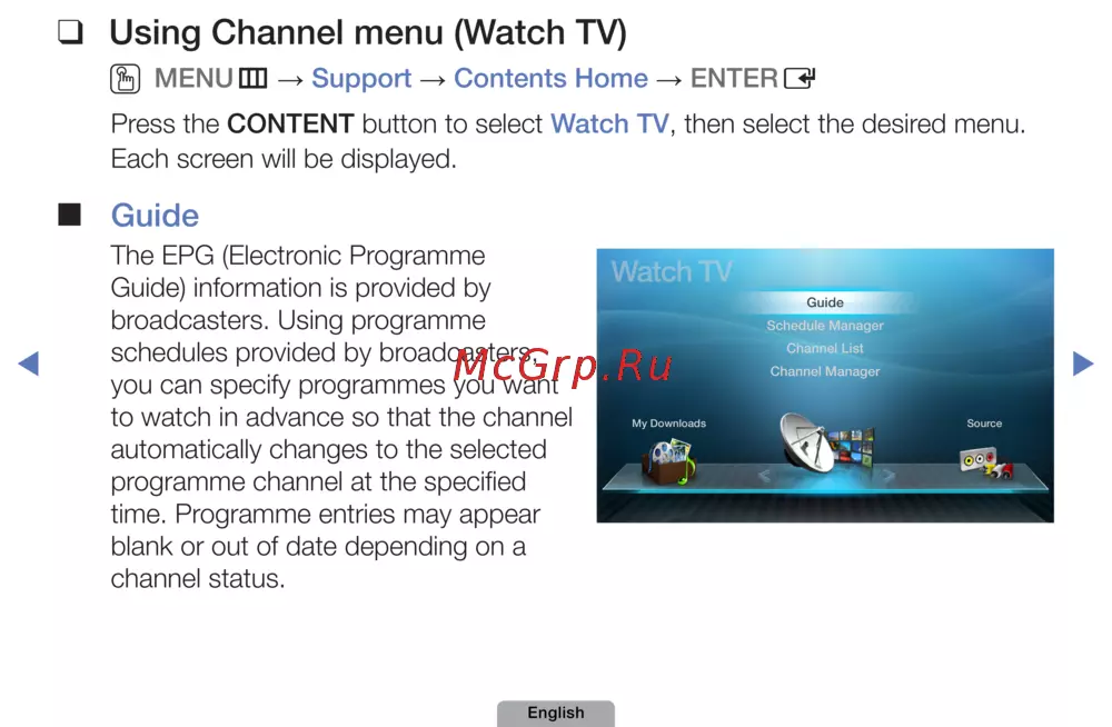 Press the CONTENT button to select Watch TV, then select the desired menu.
