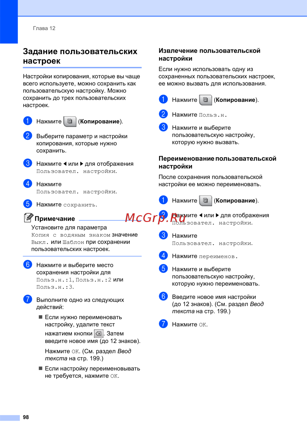 Brother MFC-990CW — настройка пользовательских параметров копирования: сохранение, вызов, переименование [110/241]