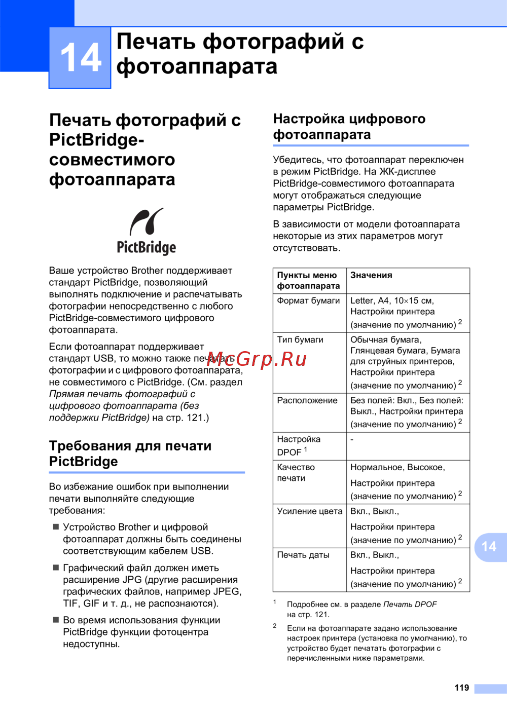 Узнайте, как печатать фотографии с цифрового фотоаппарата стандарта PictBridge. Требования к подключению, форматам файлов и настройкам Brother.
