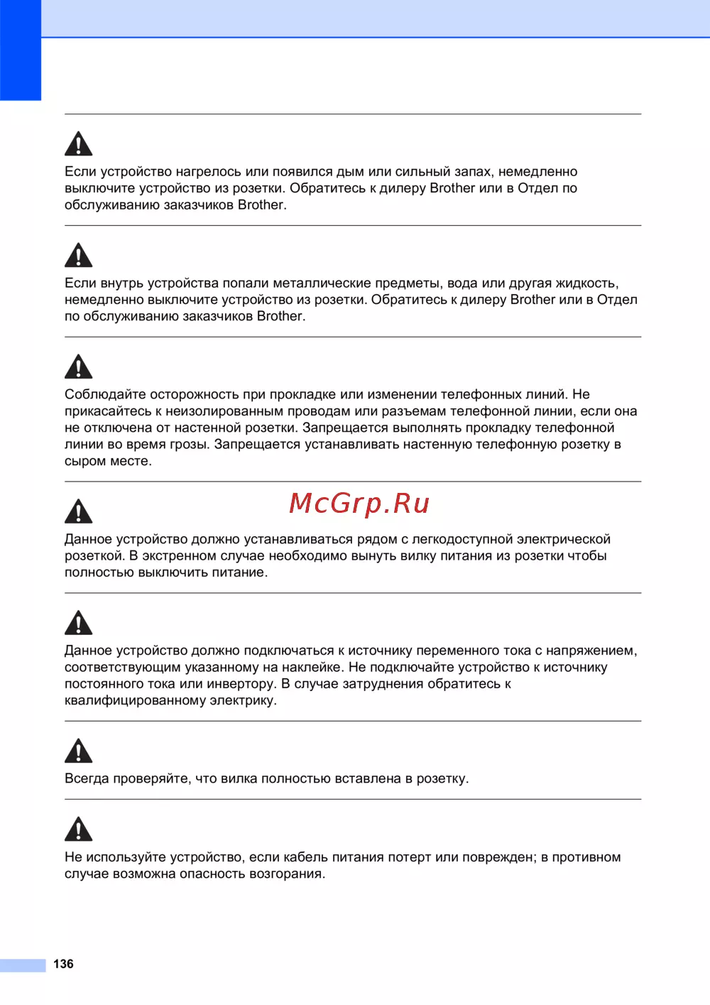 Важные рекомендации по безопасности и обслуживанию устройств Brother. Что делать при перегреве, повреждениях, прокладке телефонных линий и других экстренных ситуациях.