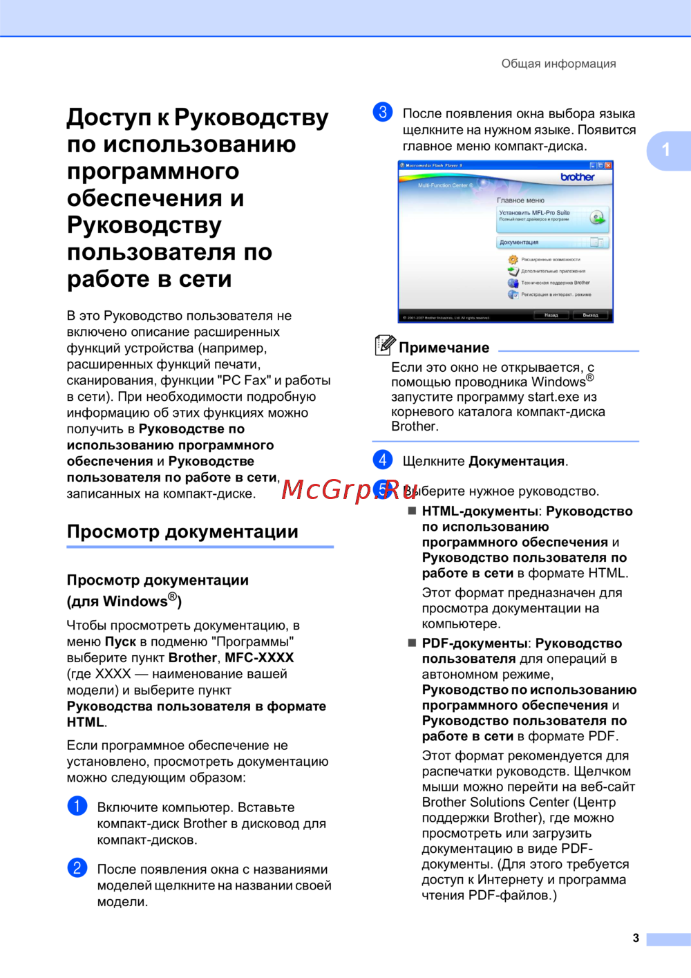 Просмотрите руководства Brother MFC в HTML или PDF. Установите ПО, откройте документацию через меню или загрузите с сайта поддержки. Подробная информация о функциях печати и работе в сети.