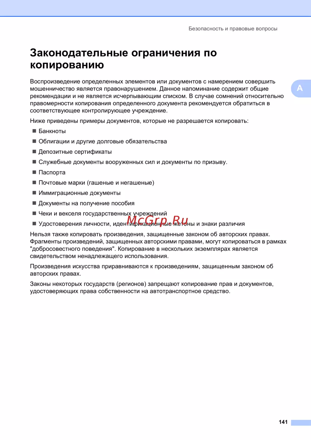 Brother MFC-990CW — законодательные ограничения на копирование документов и произведений [153/241]