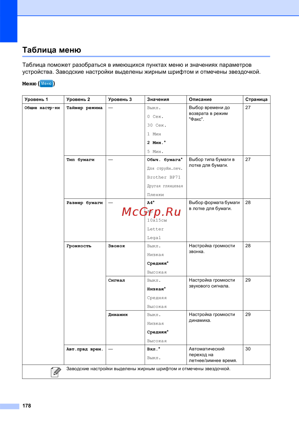 Заводские настройки выделены жирным шрифтом и отмечены звездочкой.