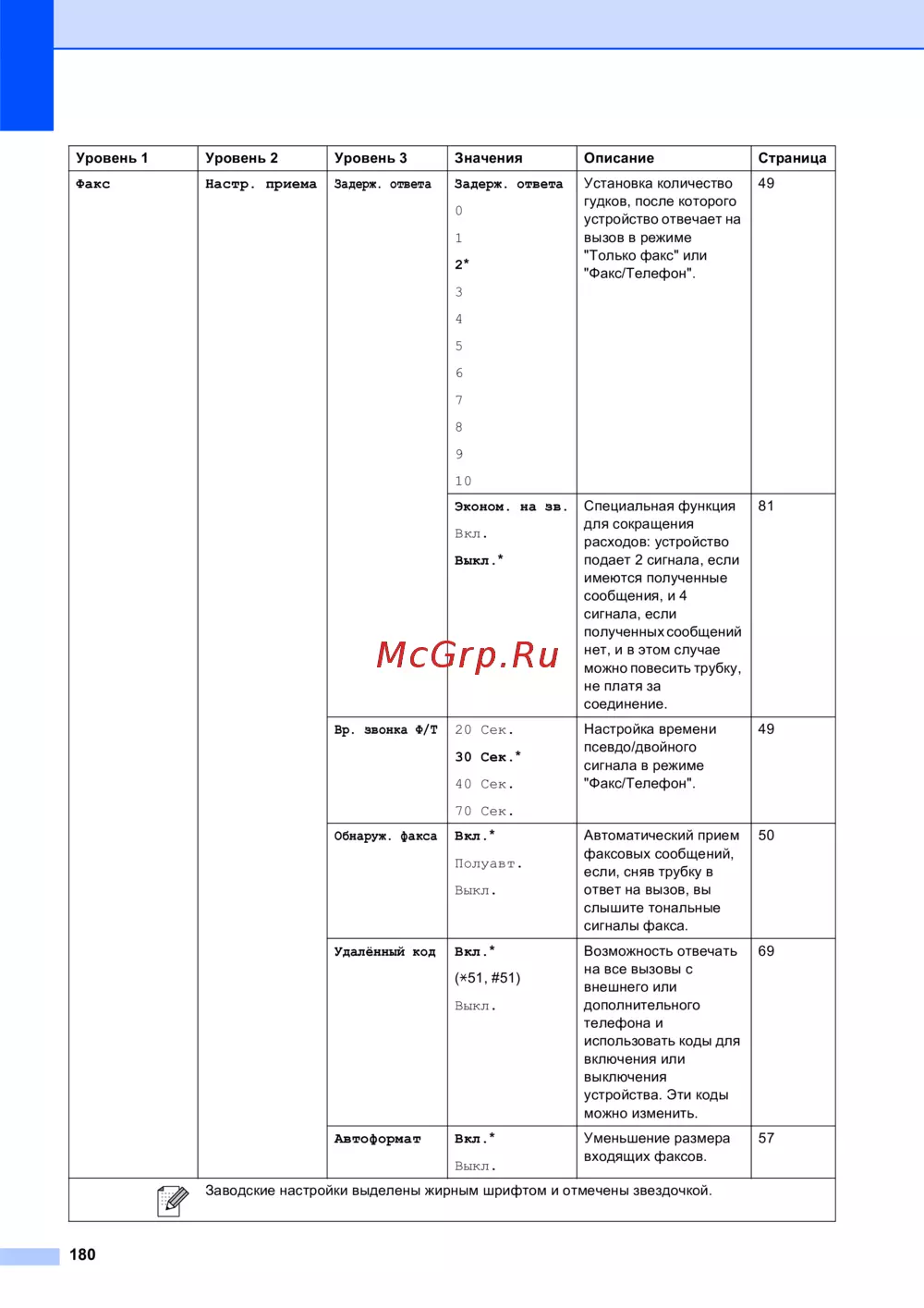 Заводские настройки выделены жирным шрифтом и отмечены звездочкой.