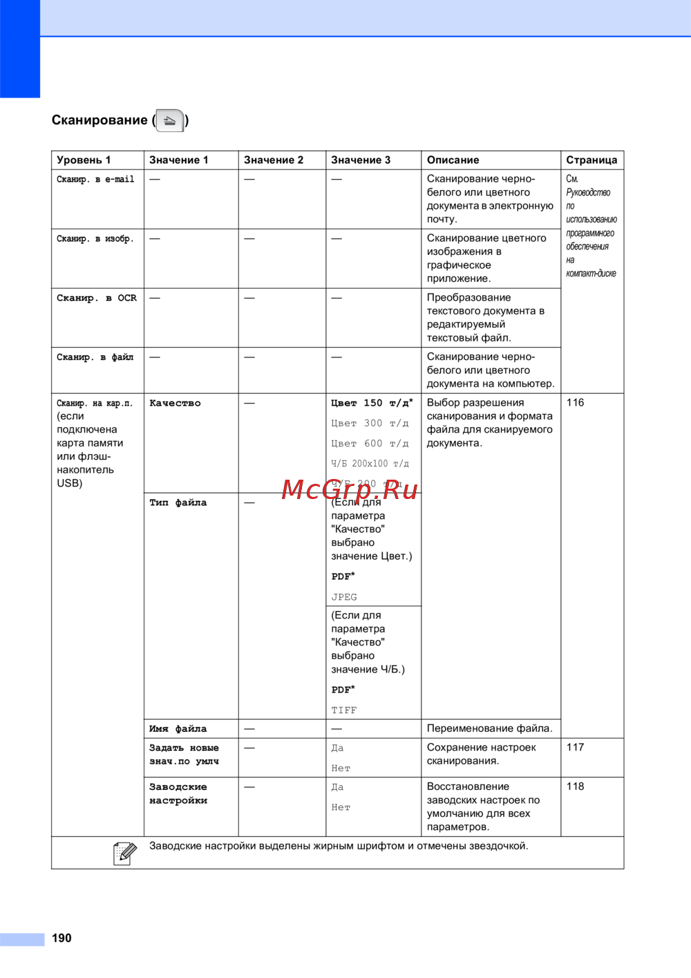 - Таблица поможет разобраться в имеющихся пунктах меню и значениях параметров устройства заводские настройки выделены жирным шрифтом и отмечены звездочкой p.190