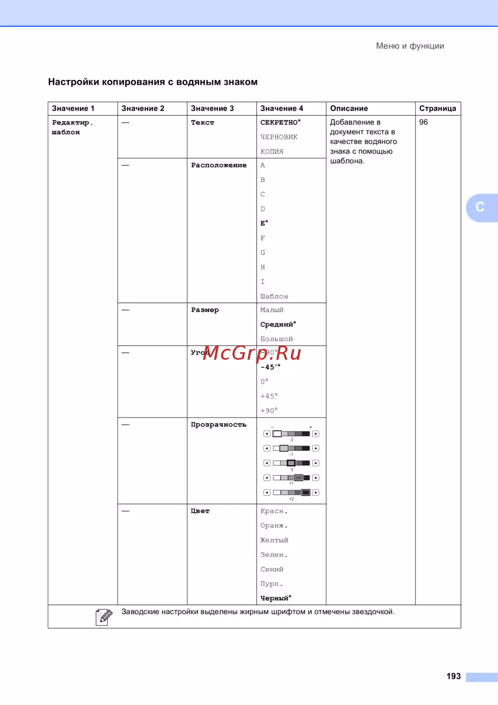Brother MFC-990CW — настройки копирования с водяным знаком: расположение, размер, угол, прозрачность и цвет [205/241]