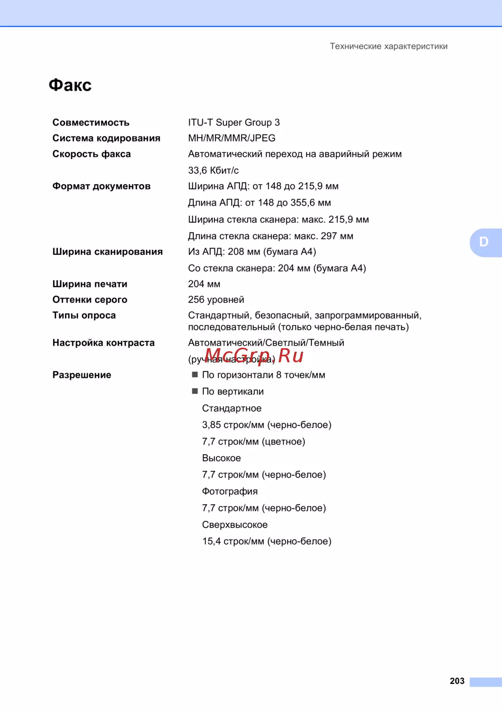 Brother MFC-990CW — технические характеристики факса ITU-T Super Group 3, MH/MR/MMR/JPEG, 33.6 Кбит/с [215/241]