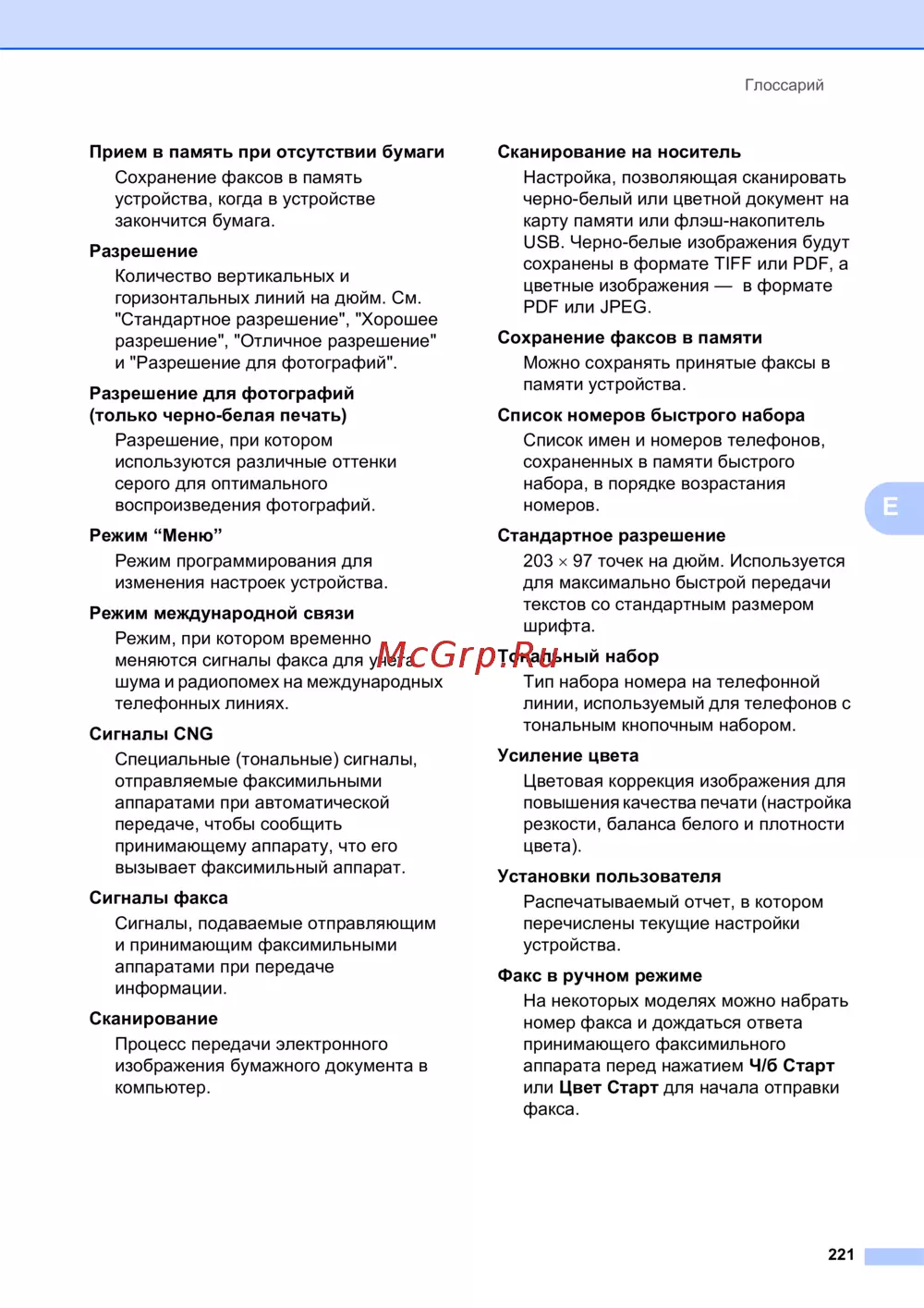 Brother MFC-990CW — глоссарий факсимильных устройств: термины, настройки, режимы работы [233/241]
