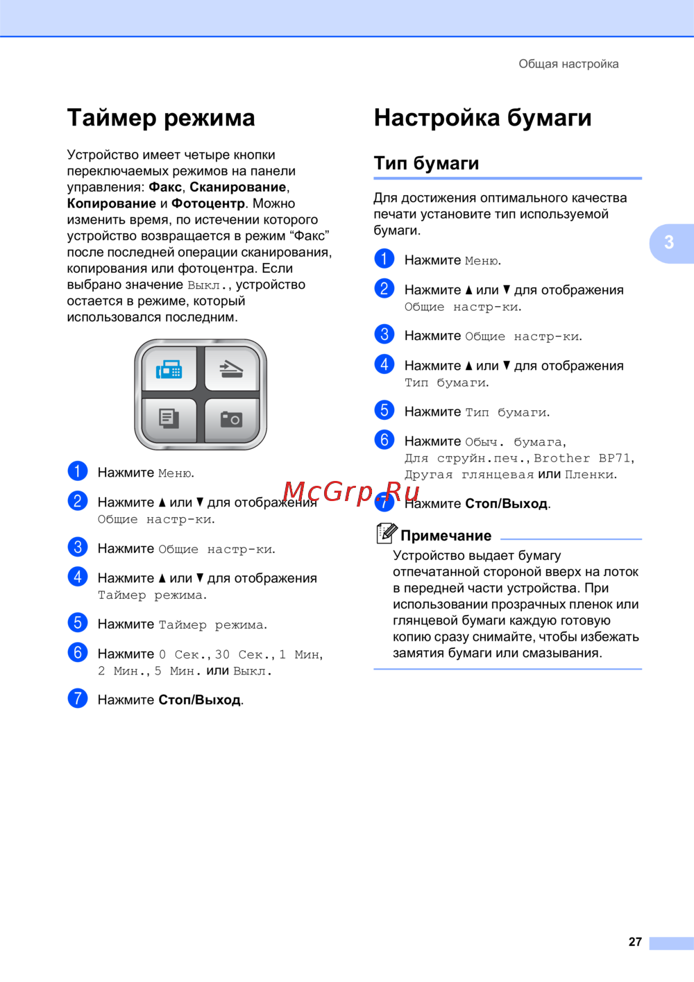 Узнайте, как настроить таймер режима и тип бумаги на копировально-факсовом оборудовании. Полные инструкции по управлению настройками для оптимальной работы и печати.