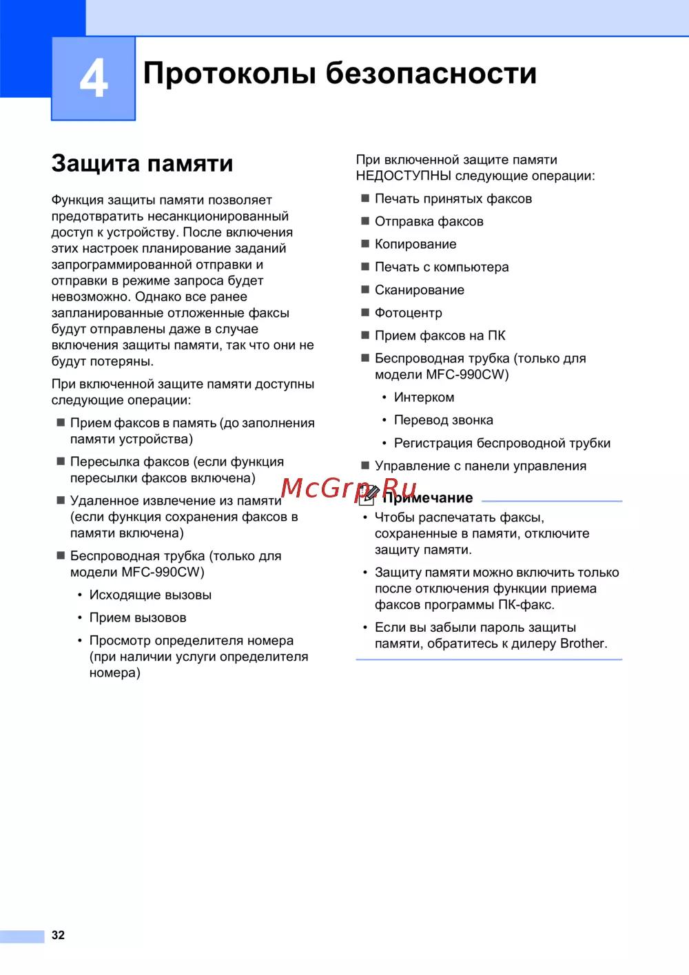 Brother MFC-990CW — защита памяти: функции и ограничения доступа к устройству [44/241]