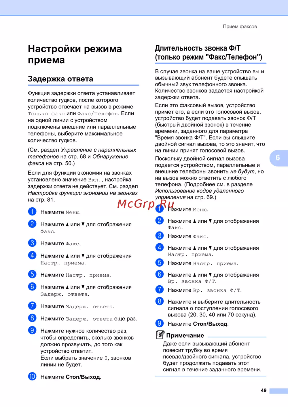 Brother MFC-990CW — настройка режима приема факсов, задержка ответа и длительности звонка [61/241]