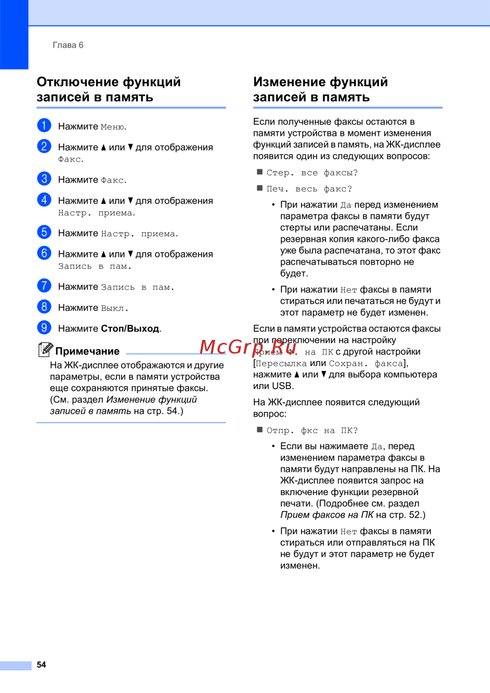 Brother MFC-990CW — настройка функций записи факсов и управление памятью устройства [66/241]