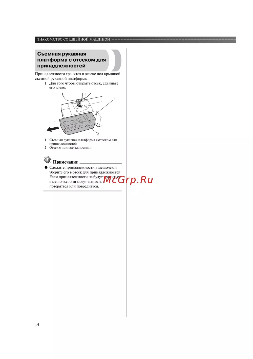 Удобная съемная платформа для швейной машины с отсеком для хранения принадлежностей. Простые инструкции по использованию и хранению инструментов.