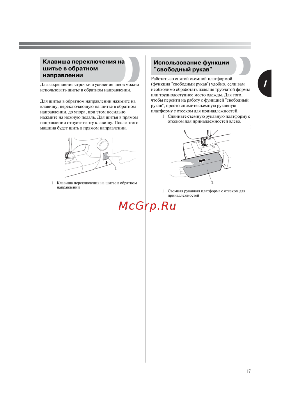 Узнайте, как работать с функцией шитья в обратном направлении для закрепления строчки и съемной платформой 'свободный рукав' для обработки трубчатых изделий и труднодоступных мест на швейной машине.