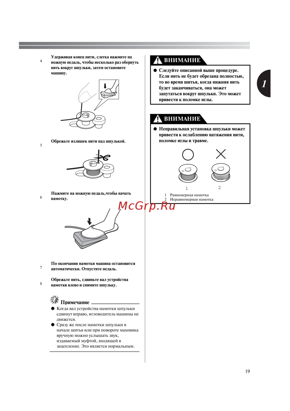 - Поворачивайте маховик машины только на себя против часовой стрелки поворот маховика в другом направлении может привести к повреждению машины p.56