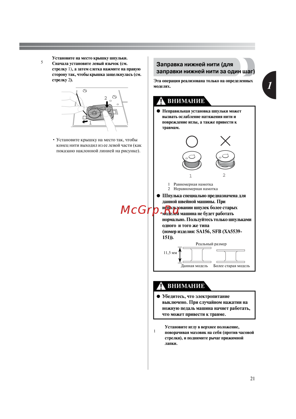 - Поворачивайте маховик машины только на себя против часовой стрелки поворот маховика в другом направлении может привести к повреждению машины p.56
