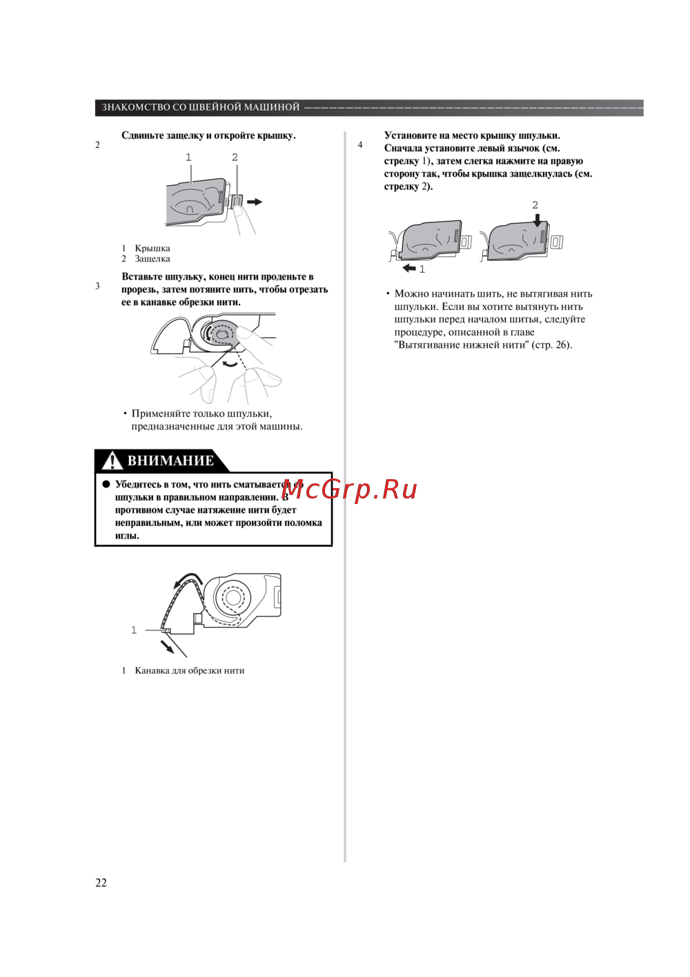 - Поворачивайте маховик машины только на себя против часовой стрелки поворот маховика в другом направлении может привести к повреждению машины p.56