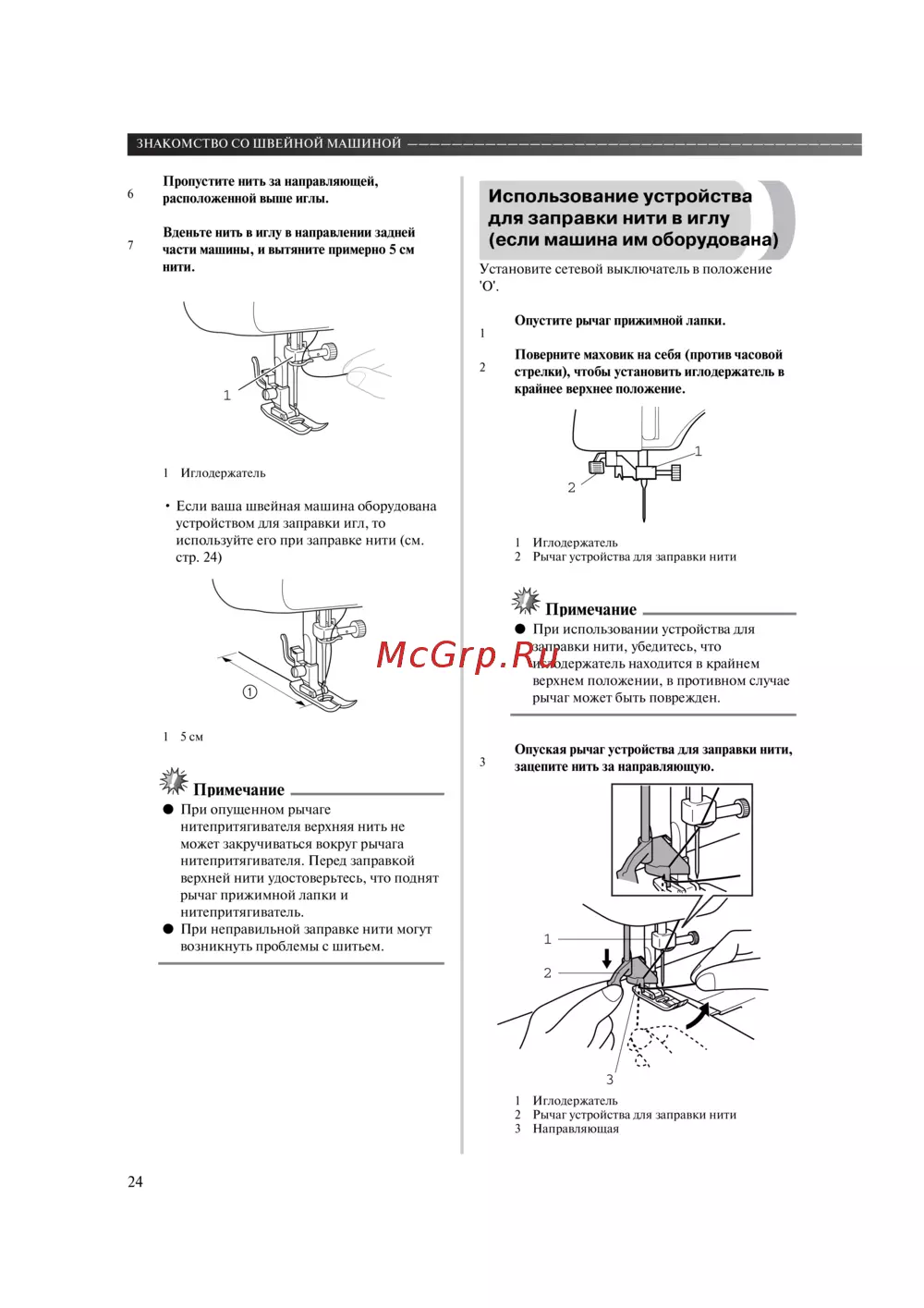 - Использование устройства для заправки нити в иглу p.25