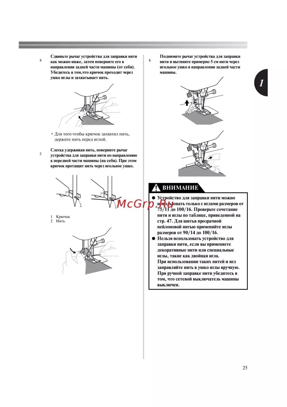 крючок протащит нить через игольное ушко.