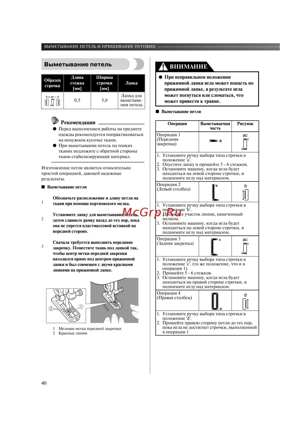 - Прорезая петлю вспарывателем для петель не кладите руку или палец на ее пути вспарыватель может соскользнуть и причинить травму p.42