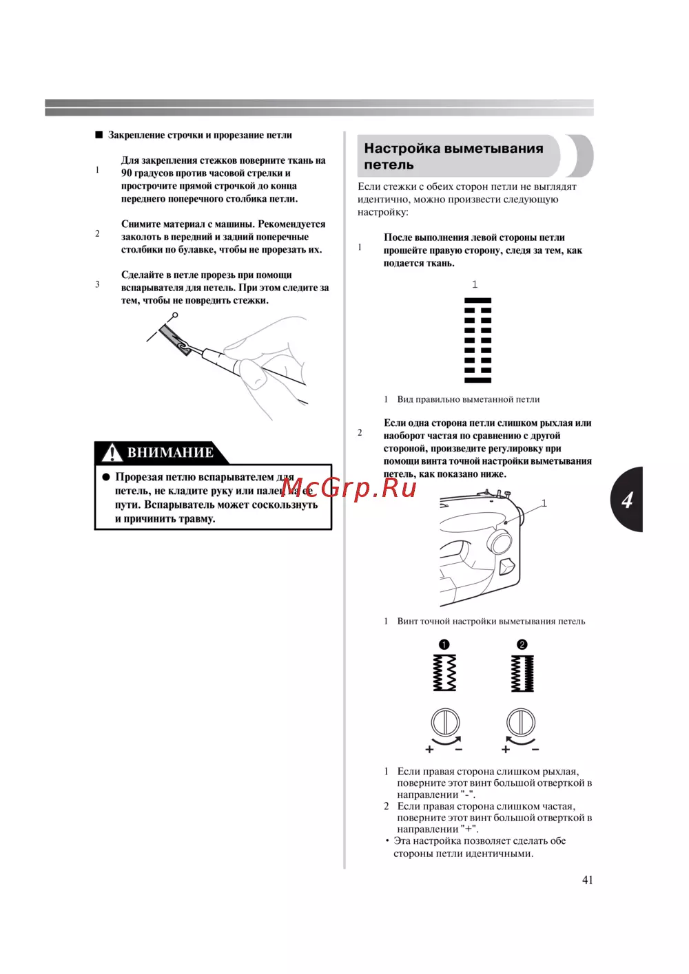- Прорезая петлю вспарывателем для петель не кладите руку или палец на ее пути вспарыватель может соскользнуть и причинить травму p.42