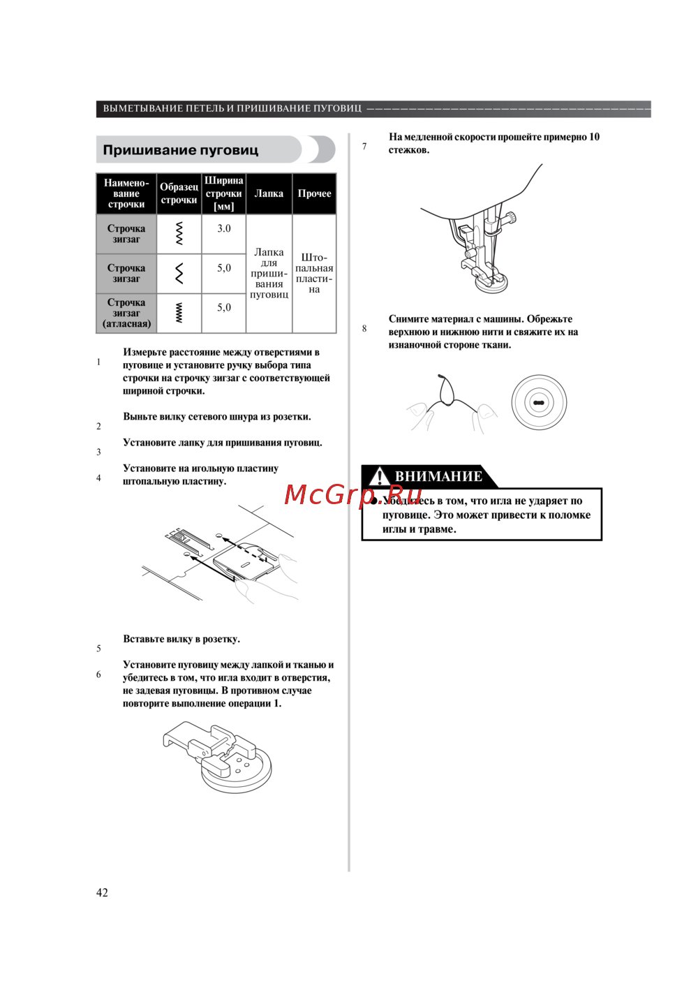 - Убедитесь в том что игла не ударяет по пуговице это может привести к поломке иглы и травме p.43