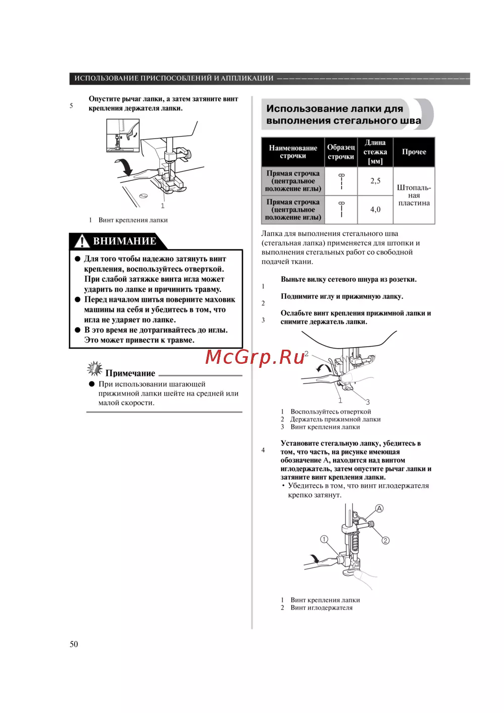 - Использование лапки для выполнения стегального шва p.51
