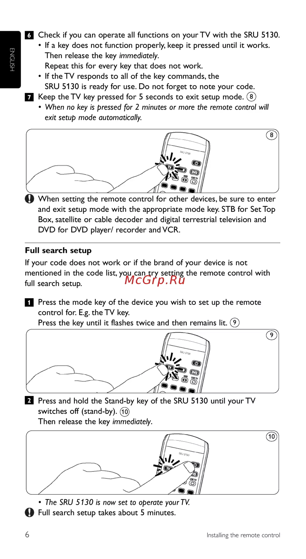 ENGLISH Check if you can operate all functions on your TV with the SRU 5130 If a key does not function properly keep it pressed until it works Then release the key immediately Repeat this for every key that does not work If the TV responds to all of the key commands the SRU 5130 is ready for use Do not forget to note your code Keep the TV key pressed for 5 seconds to exit setup mode When no key is pressed for 2 minutes or more the remote control will exit setup mode automatically Q When setting the remote control for other devices be sure to enter and exit setup mode with the appropriate mode key STB for Set Top Box satellite or cable decoder and digital terrestrial television and DVD for DVD player recorder and VCR Full search setup If your code does not work or if the brand of your device is not mentioned in the code list you can try setting the remote control with full search setup Press the mode key of the device you wish to set up the remote control for E g the TV key Press the key until it flashes twice and then remains lit El Press and hold the Stand by key of the SRU 5130 until yourTV switches off stand by Then release the key immediately The SRU 5130 is now set to operate your TV O Full search setup takes about 5 minutes 6 Installing the remote control