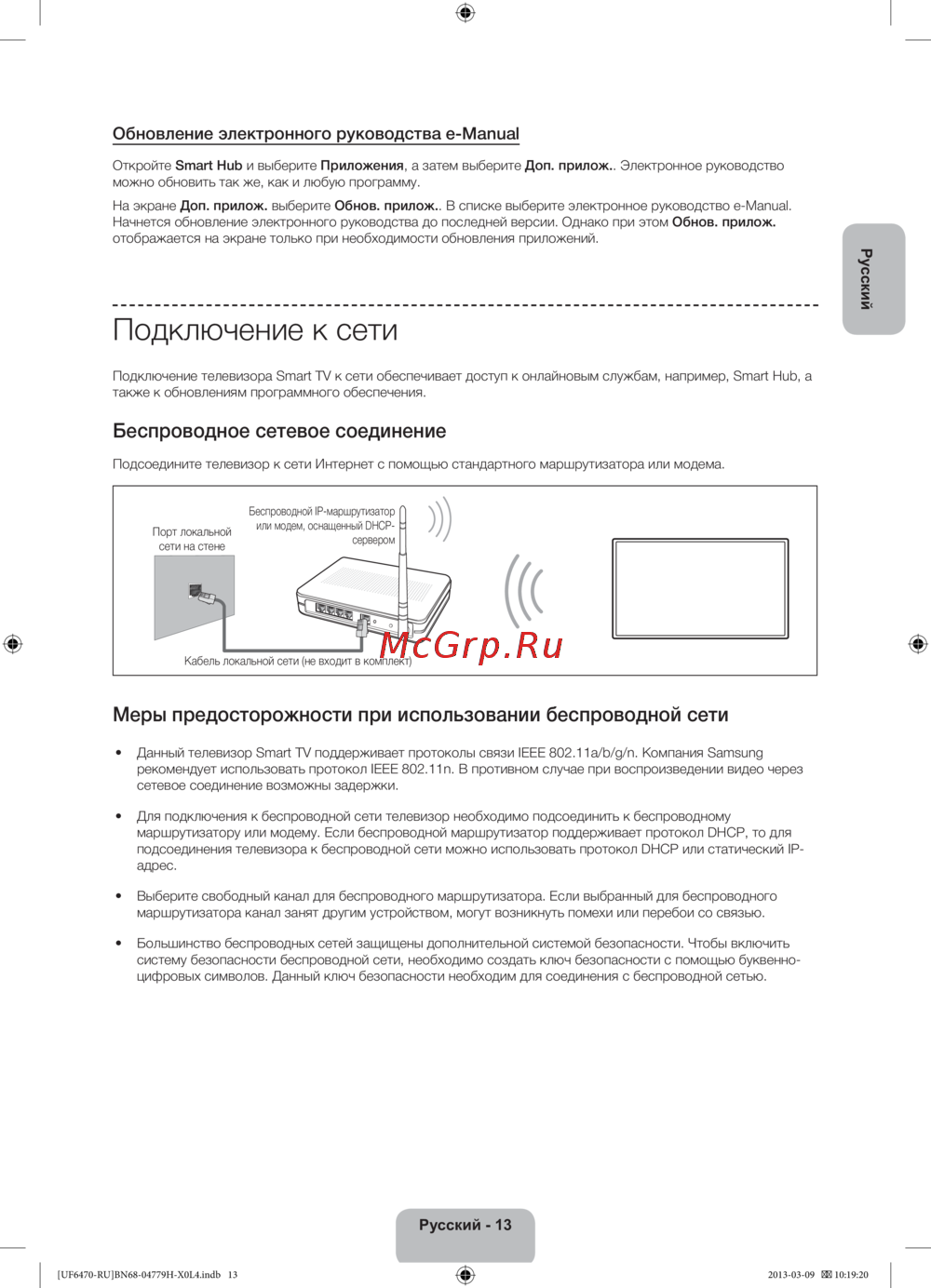 • Данный телевизор Smart TV поддерживает протоколы связи IEEE 802.11a/b/g/n. Компания Samsung