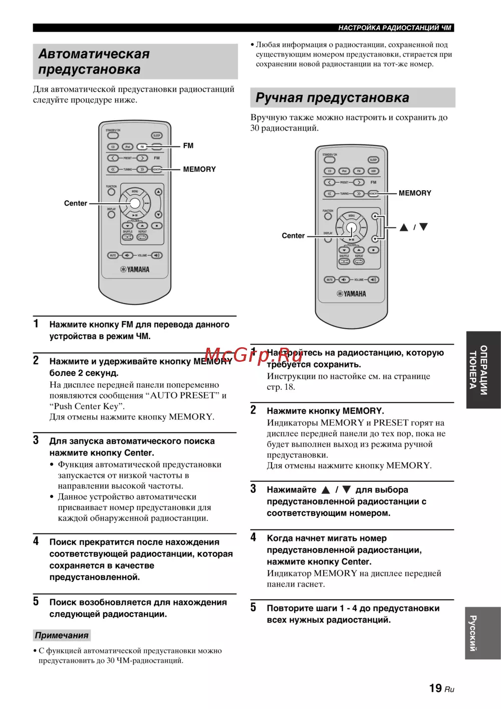 - Существуют 2 метода настройки автоматическая и ручная автоматическая настройка эффективна в тех случаях когда поступающие от радиостанций сигналы достаточно сильны и отсутствуют помехи при слабом сигнале радиостанции выполните произведите ручную настройку также можно использовать автоматическую или ручную настройку для сохранения до 30 радиостанций p.20