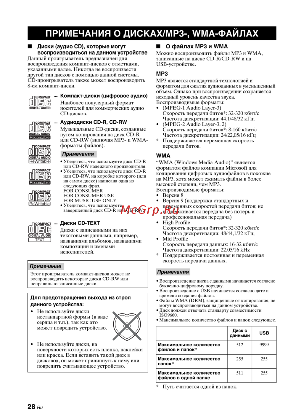 - Диски аудио cd которые могут воспроизводиться на данном устройстве p.30