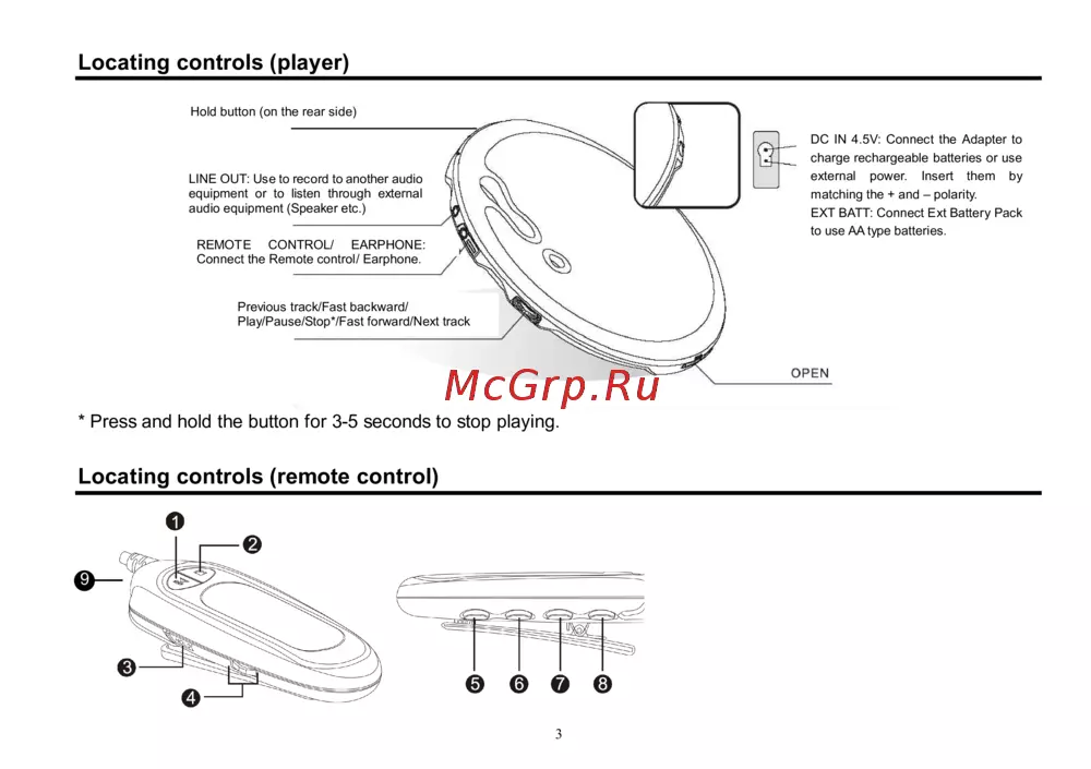 - Press and hold the button for 3 5 seconds to stop playing p.3