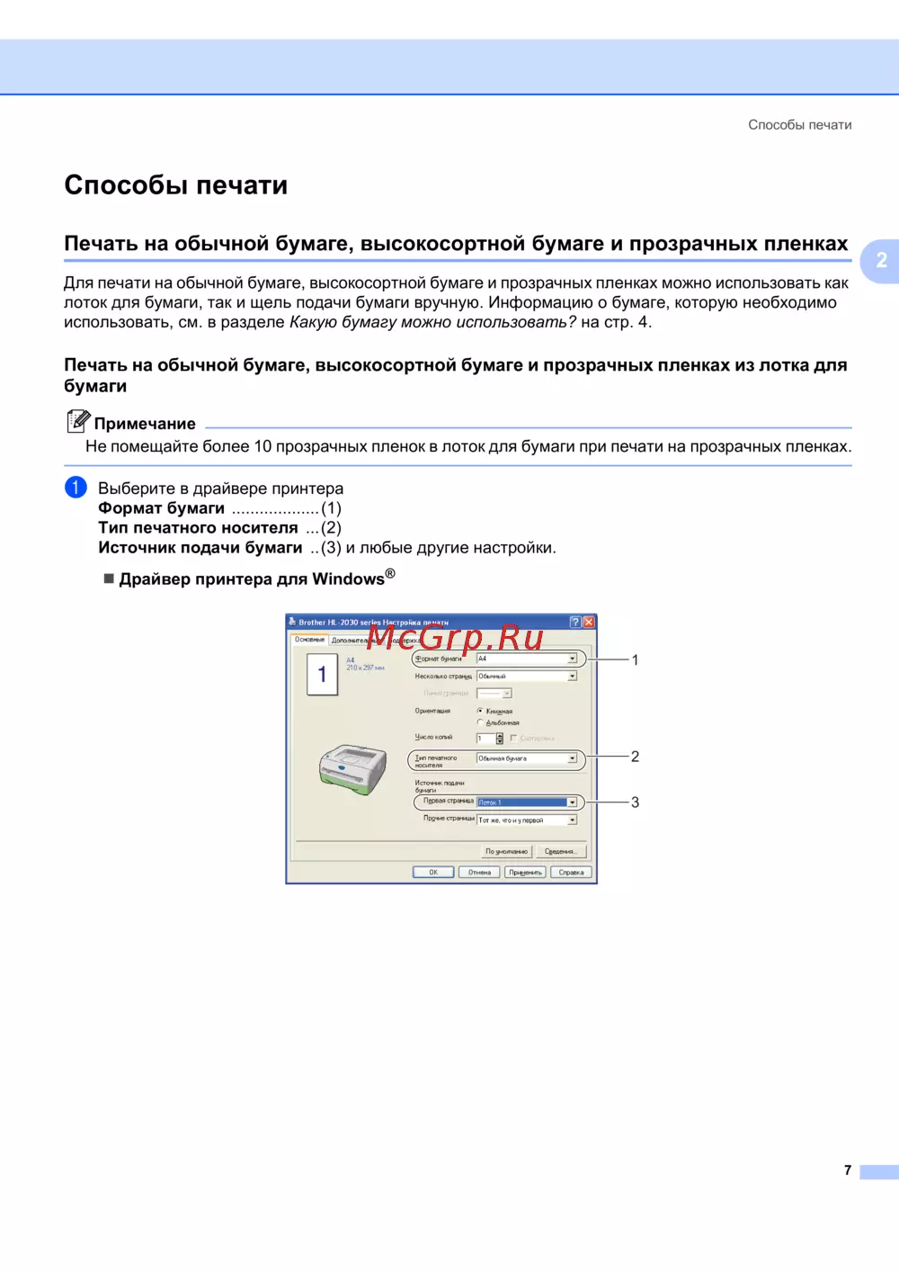 Brother HL-2035R — способы печати на бумаге и пленках: настройки и подача [14/94]