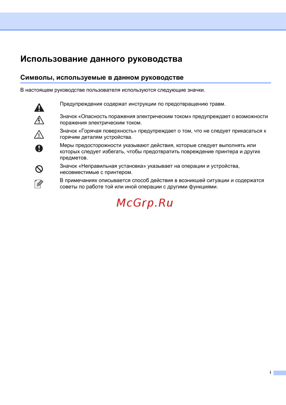 Brother HL-2035R — руководство по безопасности использования принтера: значки и предупреждения [2/94]