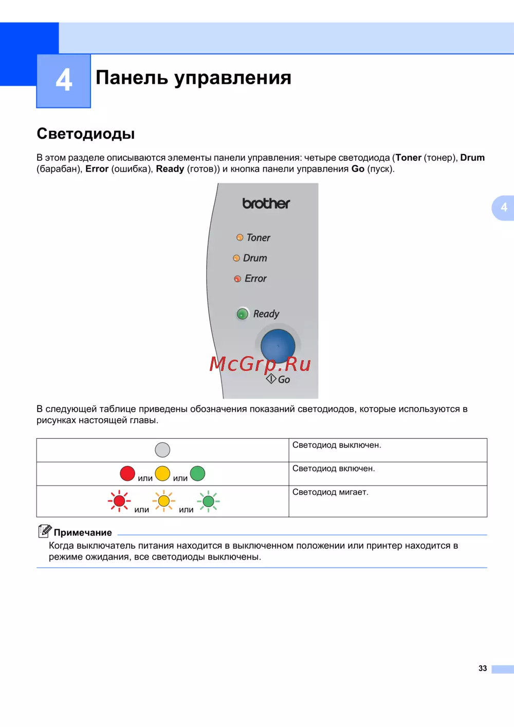 - Запишите показания светодиодов и сообщите об ошибке согласно приведенной выше таблице дилеру или в авторизованный сервисный центр компании brother p.45