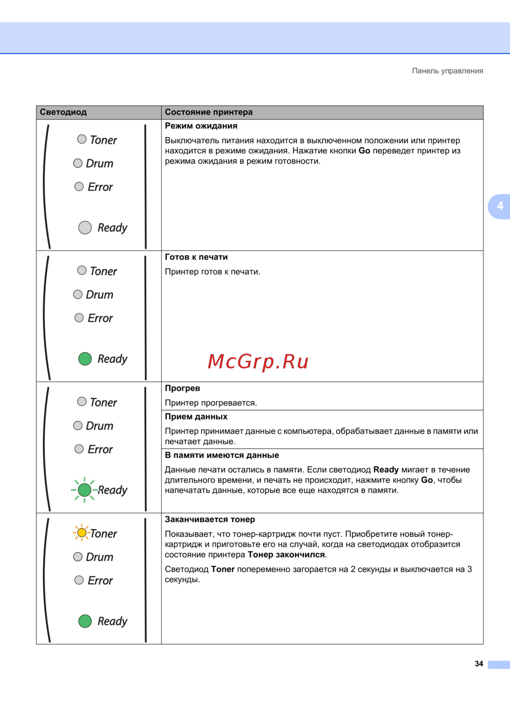 Brother HL-2035R — состояния светодиодного индикатора принтера: руководство и объяснение [41/94]