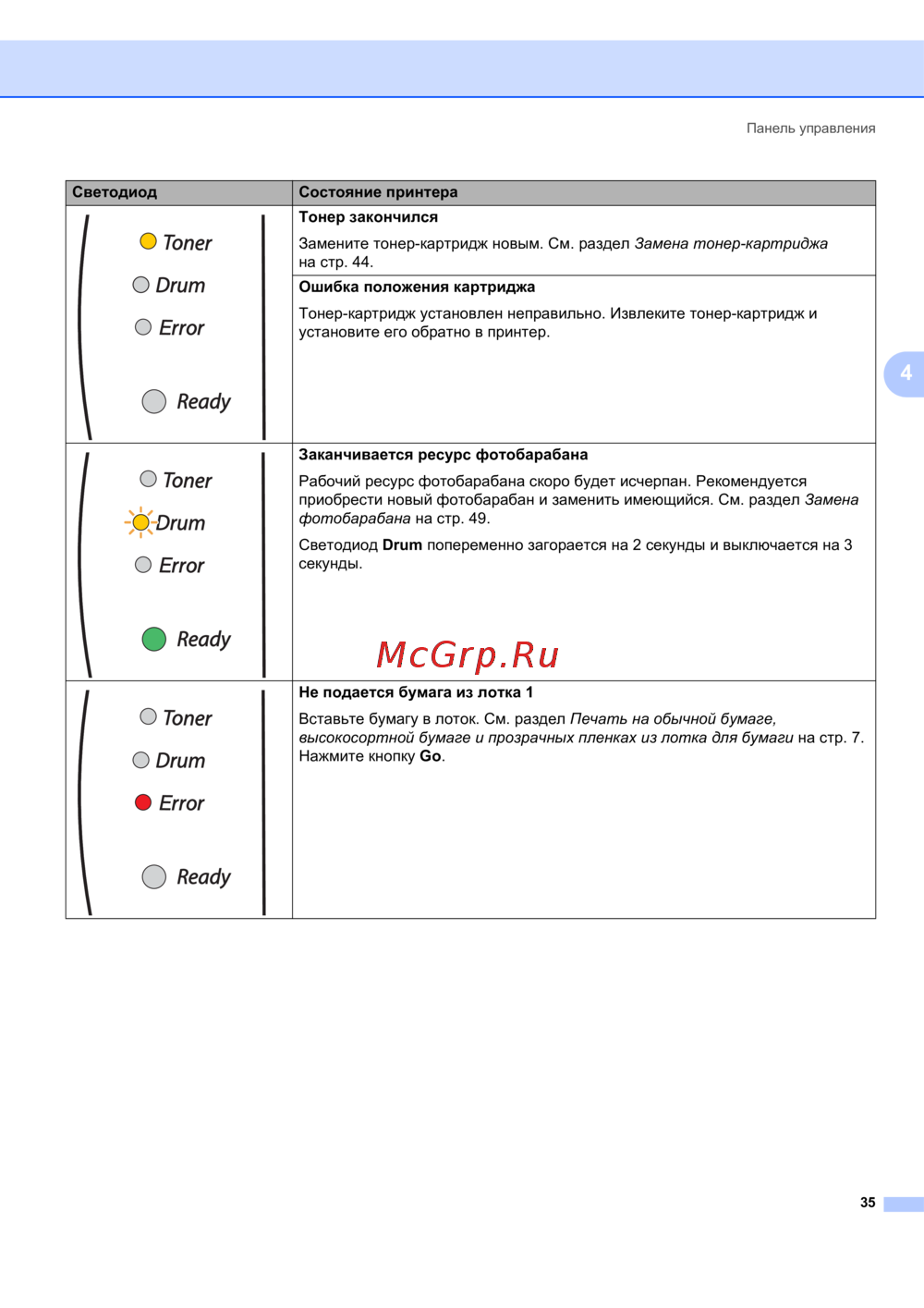 - Принтер будет сообщать о неполадках печатая сообщение об ошибке согласно следующей таблице выполните действия по устранению ошибки соответствующие сообщению об ошибке p.67