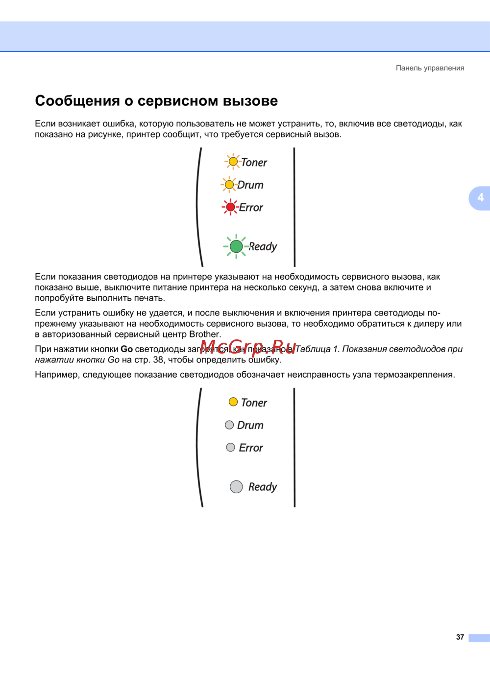 - Запишите показания светодиодов и сообщите об ошибке согласно приведенной выше таблице дилеру или в авторизованный сервисный центр компании brother p.45