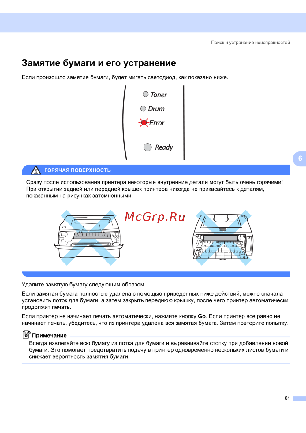 - Сразу после использования принтера некоторые внутренние детали могут быть очень горячими дождитесь когда принтер остынет прежде чем прикасаться к его внутренним деталям p.61
