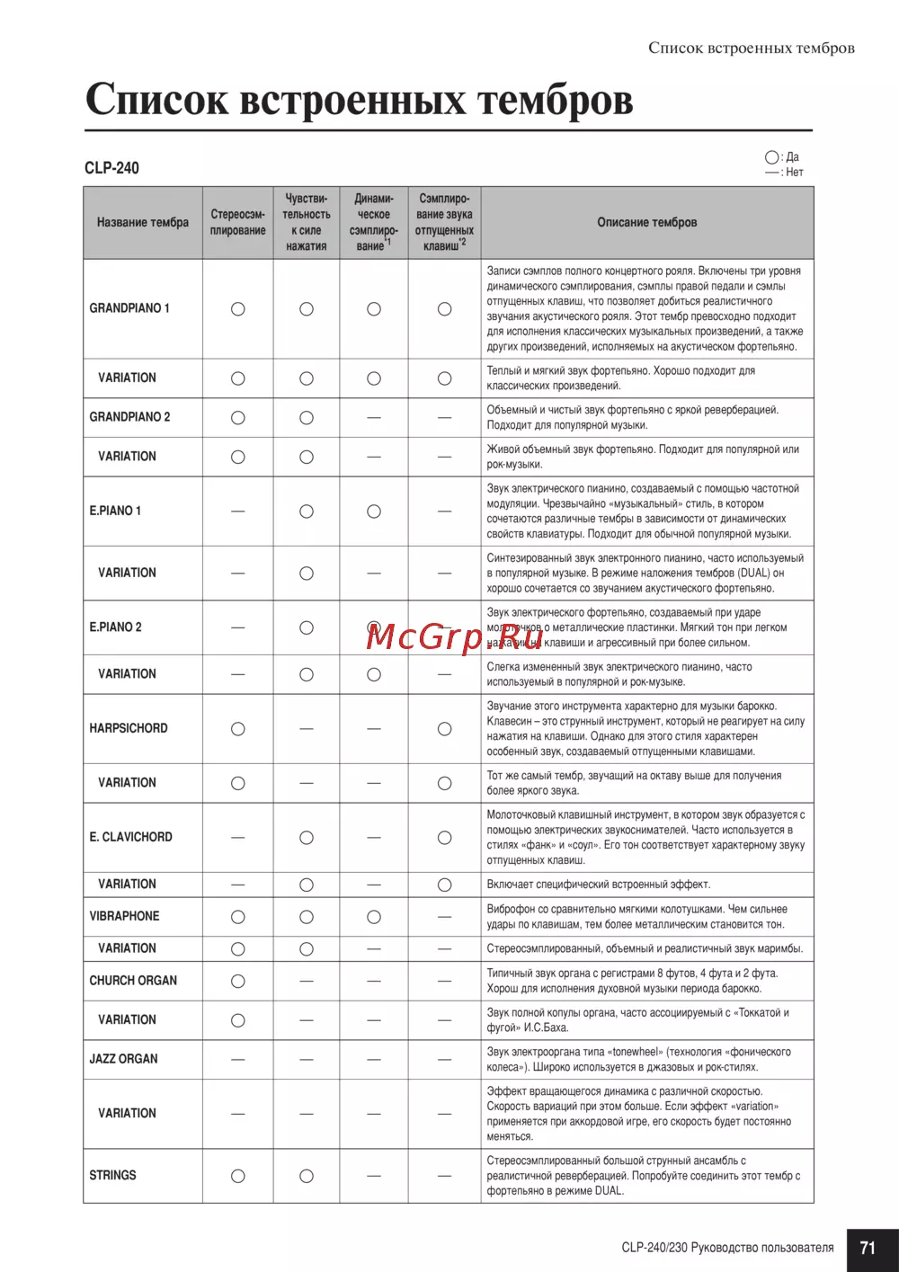 Yamaha CLP-240 Clavinova [71/90] Список встроенных тембров