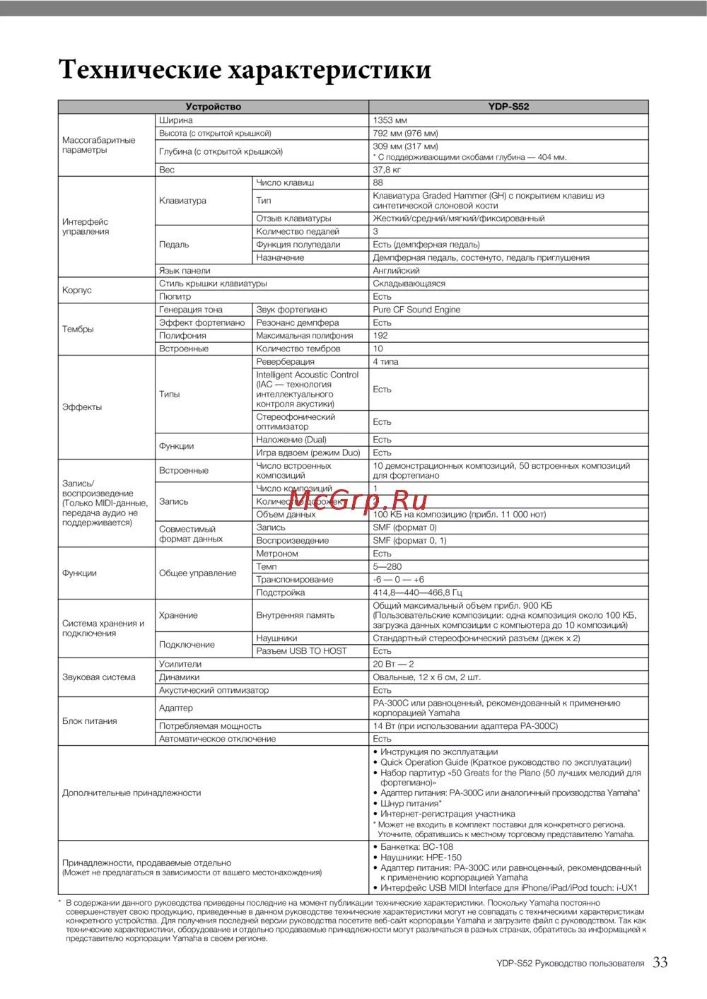 * В содержании данного руководства приведены последние на момент публикации технические характеристики. Поскольку Yamaha постоянно